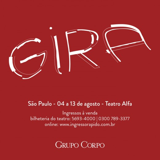 O Grupo Corpo estreia GIRA, a nova coreografia, com trilha musical especialmente composta e interpretada para o espetáculo pelo grupo paulista Metá Metá. Considerada uma das expressões mais inovadoras da cena musical brasileira, a banda tem marcante presença africana em suas composições. Bach, uma das mais prestigiadas coreografias de Rodrigo Pederneiras, com trilha sonora de Marco Antônio Guimarães, inspirada em J. S. Bach, complementará o programa. Um jogo entre o que se ouve e o que se vê, em que o barroco de Bach e o barroco de Minas Gerais se realizam como dança.